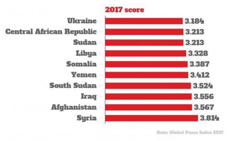 La polul opus se situează Siria, care rămâne cea mai periculoasă ţară din lume, alături de Afganistan, Irak, Sudanul de Sud şi Yemenul.