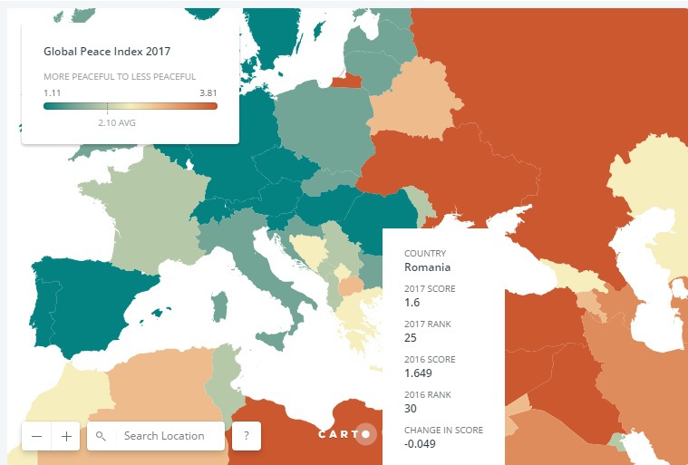 În ceea ce priveşte România, ţara noastră se situează în rândul ţărilor paşnice, înregistrând un scor de 1,6 şi ocupând, astfel, locul al 25-lea în lume. La acest capitol, al păcii interne, înregistrăm o creştere faţă de anul 2016, când ocupam locul 30 la nivel mondial.