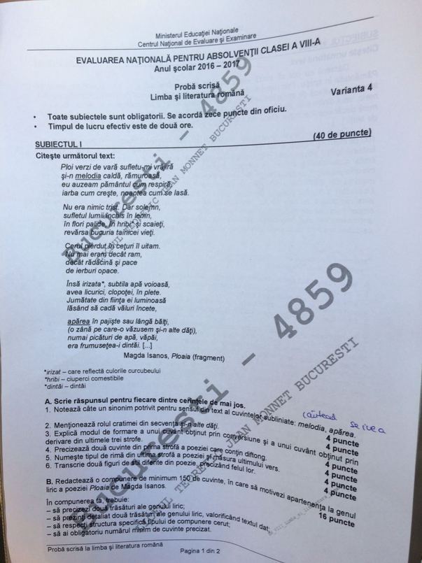 EVALUAREA NAŢIONALĂ 2017. Ei au avut de rezolvat două subiecte, primul cu cerinţe legate de un fragment din poezia „Ploaia” de Magda Isanos, printre care şi redactarea unei compuneri în care să se motiveze apartenenţa la gen liric a operei. La al doilea subiect, elevii au primit un text extras dintr-o revistă, pe margina căruia au avut de răspuns la mai multe întrebări, dar şi de scris o naraţiune de 150-300 de cuvinte în care să se prezinte o întâmplarea reală sau imaginară din timpul unei competiţii sportive.