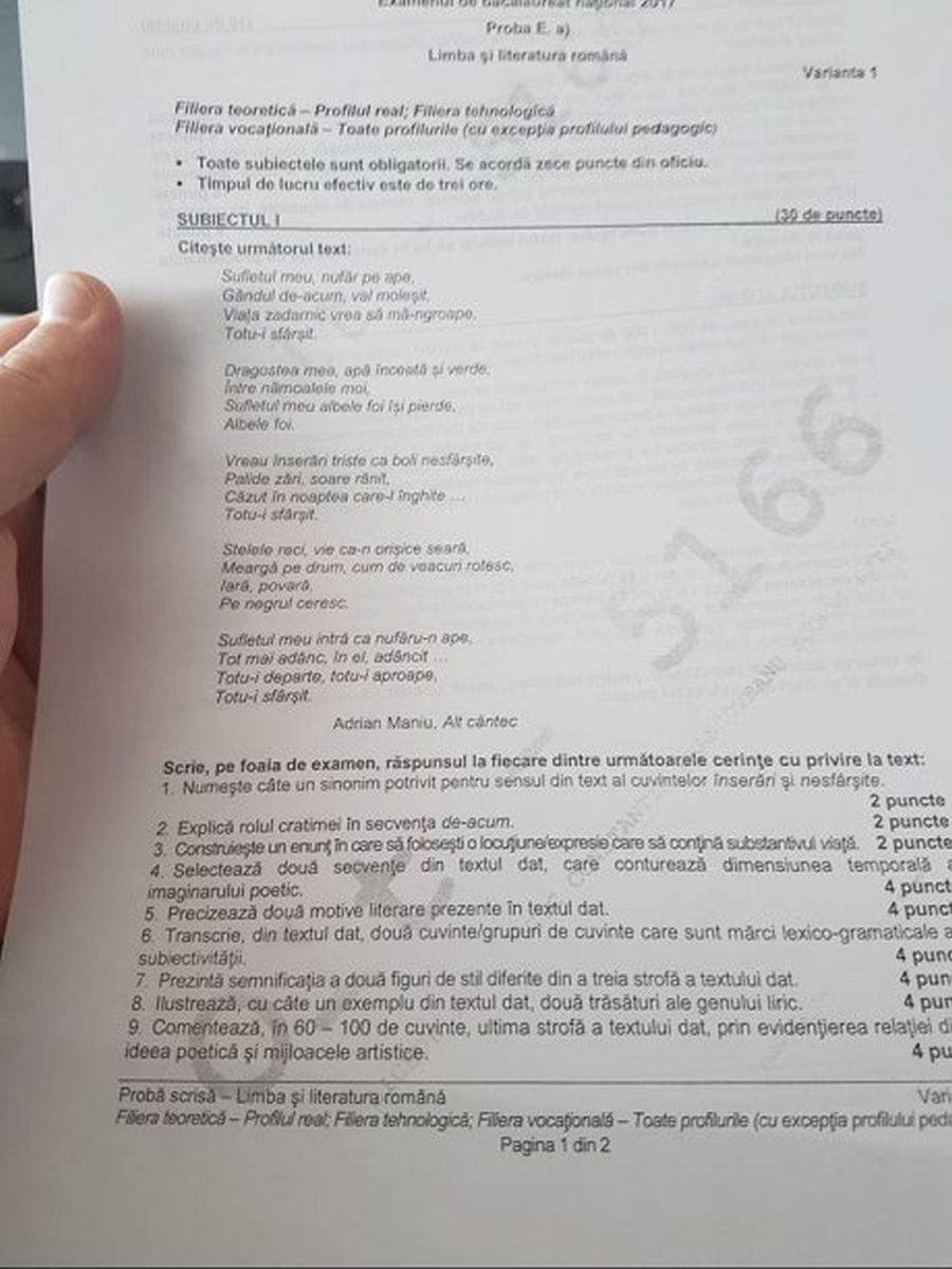 Subiecte barem ROMÂNĂ BACALAUREAT 2017. La primele două subiecte au avut de rezolvat mai multe cerinţe legate de o poezie de Adrian Maniu, ”Alt Cântec”, precum şi de scris un text argumentativ de 150-300 de cuvinte despre rolul comunicării în reuşita unui proiect de echipă. Mai jos găsiţi subectele: