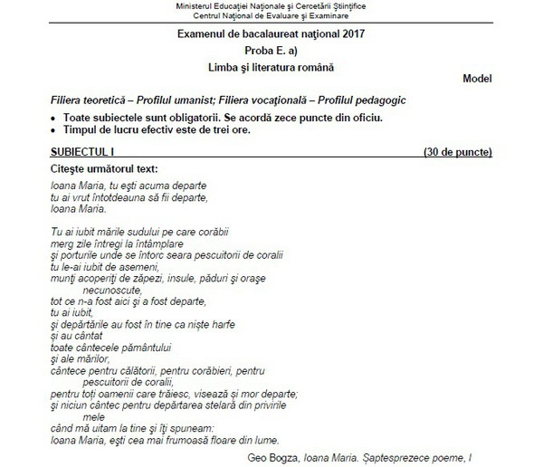 Subiecte barem ROMÂNĂ BACALAUREAT 2017. Cu alte cuvinte, nota comisiei de contestaţii este finală, întrucât nu se mai aplică regula celor 0,5 puncte diferenţă între nota de la evaluarea iniţială şi cea de la contestaţii.