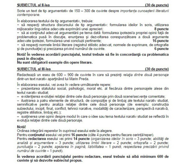 Subiecte barem ROMÂNĂ BACALAUREAT 2017. Proba scrisă la Limba şi Literatură Română a început la ora 09.00 şi constă în trei subiecte, fiecare cu 30 de puncte. La primul, elevii au de rezolvat câteva exerciţii pe baza unui text la prima vedere, partea cea mai grea la acest subiect fiind ultimul subpunct în care tinerii trebuie să facă un mini-eseu în baza unui fragment din textul dat.
