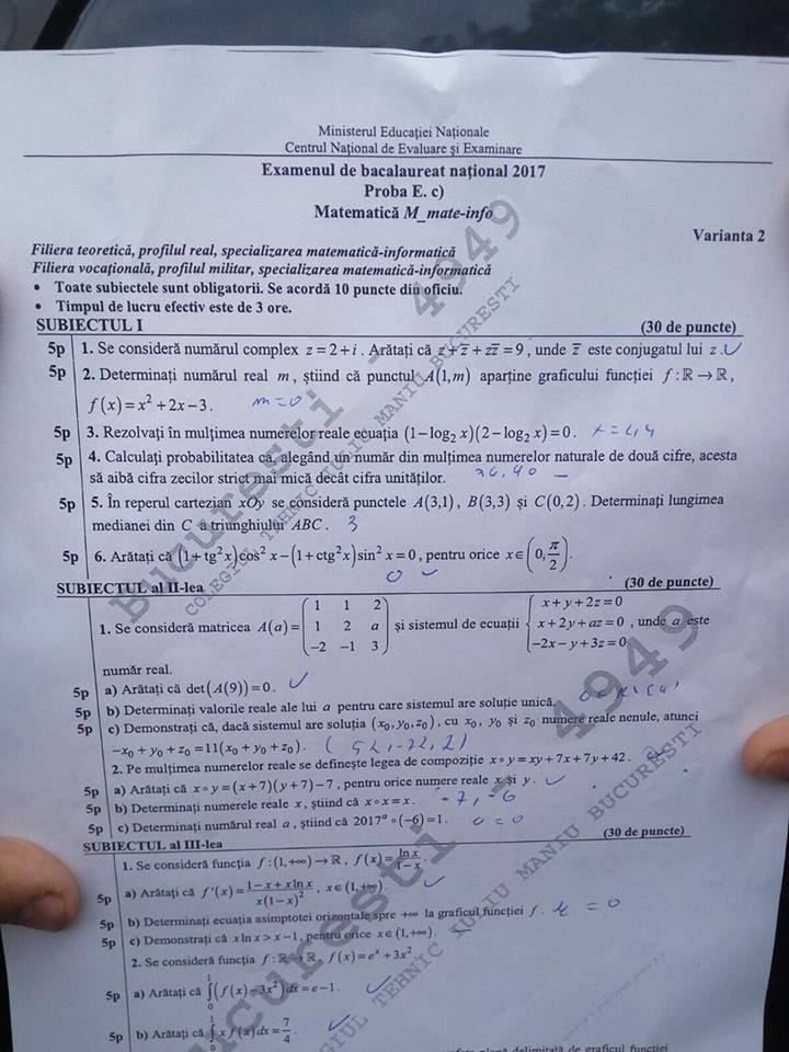 BAC 2017 MATEMATICĂ şi ISTORIE. Subiecte şi barem . Timpul destinat redactării unei lucrări scrise este de trei ore, calculat din momentul în care s-a încheiat distribuirea subiectelor fotocopiate pentru fiecare candidat. Pentru rezolvarea subiectelor, candidaţii folosesc numai cerneală sau pastă de culoare albastră, iar pentru executarea schemelor şi a desenelor vor utiliza numai creion negru, anunţă Ministerul Educaţiei.