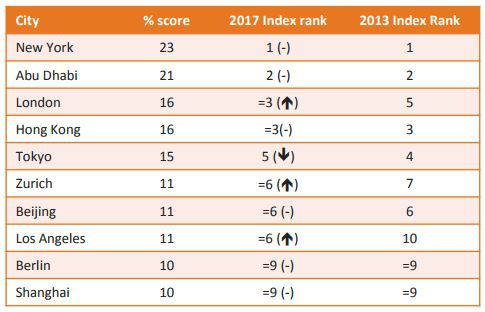 În ceea ce priveşte oportunităţile deschiderii unei afaceri, topul este condus de New York, urmat de Abu Dhabi şi Londra şi Hong Kong, situate la egalitate. Capitala engleză a urcat două poziţii în acest top faţă de indexul din 2013.