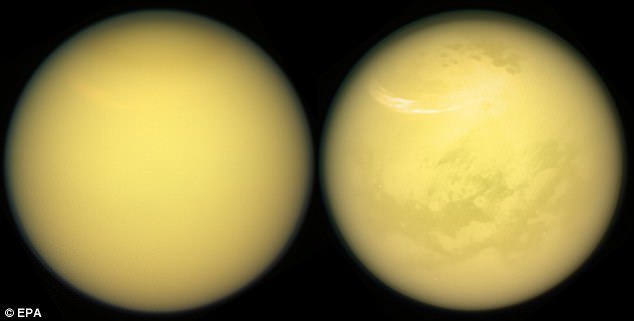 Suprafaţa lui Titan se poate vedea cu un detaliu incredibil, precum se poate vedea şi atmosfera sa în continuă schimbare, scrie Daily Mail.