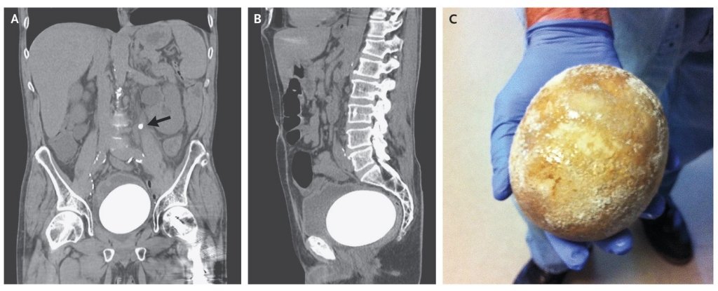 Tomografiile computerizate au dovedit existenţa a două pietre în vezica urinară a bărbatului. Piatra cu dimensiuni reduse a fost descoperită în uretra ce conectează rinichiul stâng de vezică, iar a doua piatră cu o dimensiune gigantă a fost descoperită în vezică.