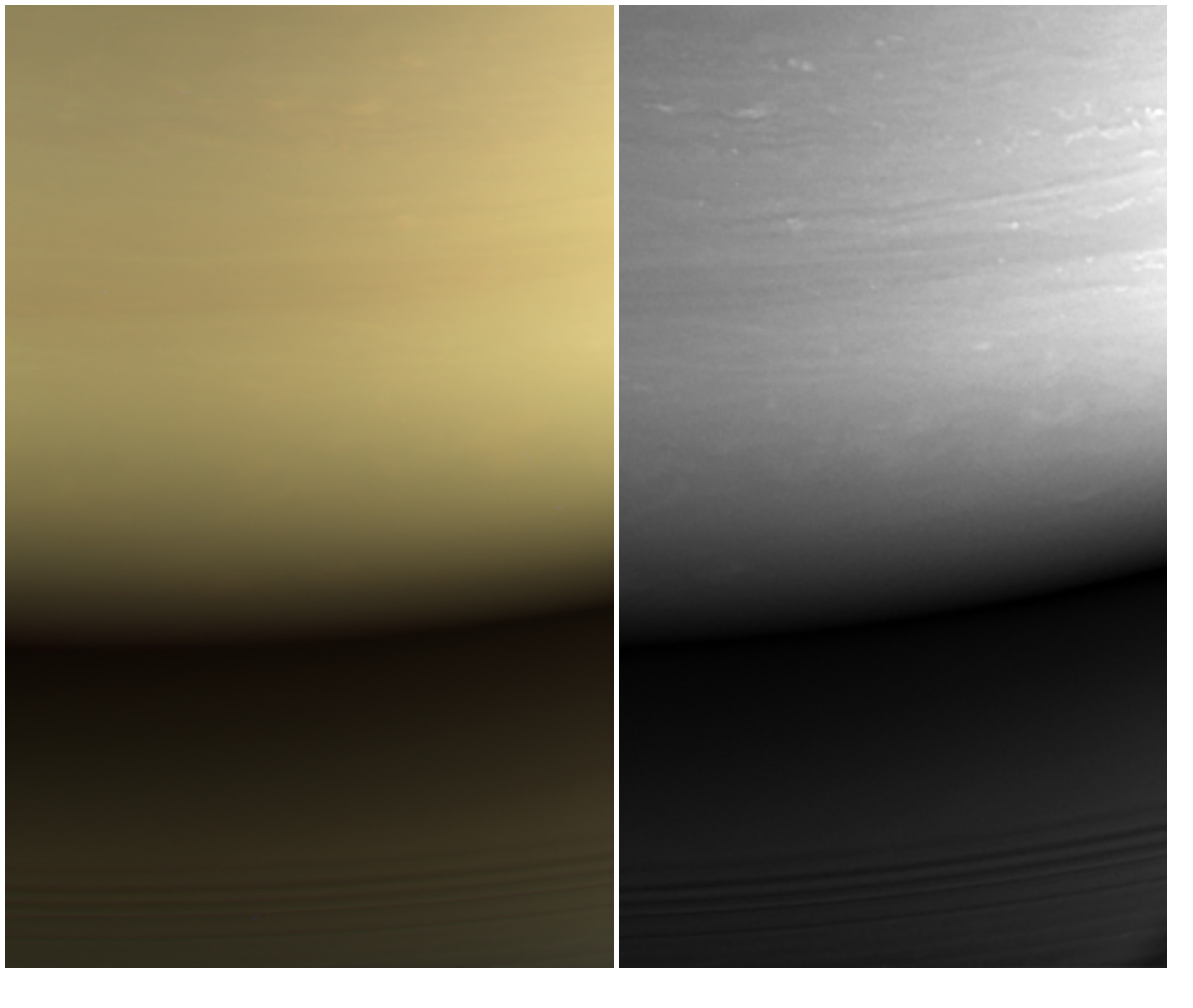 Într-o zonă din fotografia alb-negru este reflectată lumina provenită de la inelele de gheaţă ale lui Saturn. Conform NASA, imaginea a fost realizată atunci când Saturn nu se afla pe traiectoria Soarelui, dar atunci când transmisiunea sondei cu Pământul s-a încheiat pe planetă era zi.