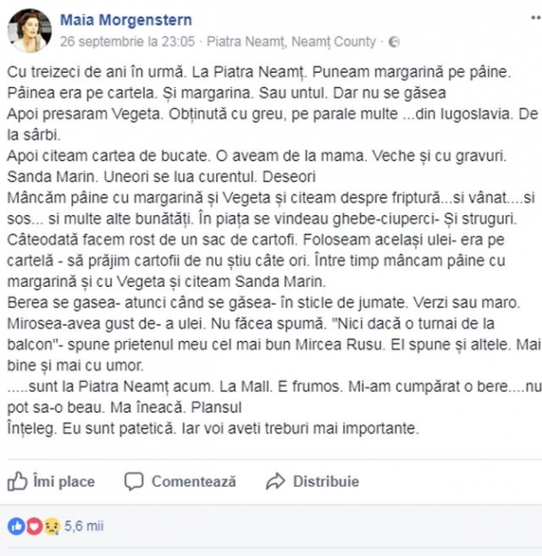 „Cu treizeci de ani în urmă. La Piatra Neamţ. Puneam margarină pe pâine. Pâinea era pe cartela. Şi margarina. Sau untul. Dar nu se găsea.
