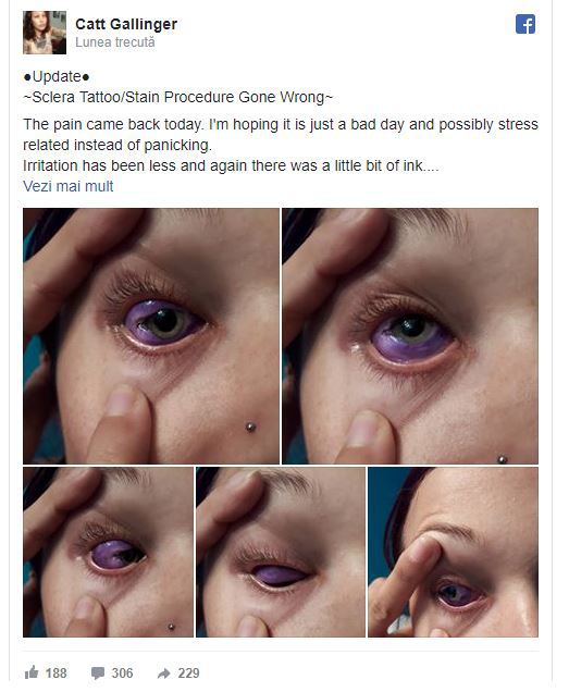 În ziua procedurii, cerneala mov a început să se scurgă din ochiul tinerei. A doua zi, ochiul a început să se umfle şi în cele din urmă s-a infectat şi a devenit dureros. Trei săptămâni mai târziu, umflătura internă a persistat, iar doctori i-au spus că  ar putea rămâne fără vedere în cazul ochiului infectat. Gallinger a început să publice imagini pe Facebook cu problema sa pentru a-i avertiza şi pe ceilalţi tineri care doresc să-şi tatueze globul ocular.