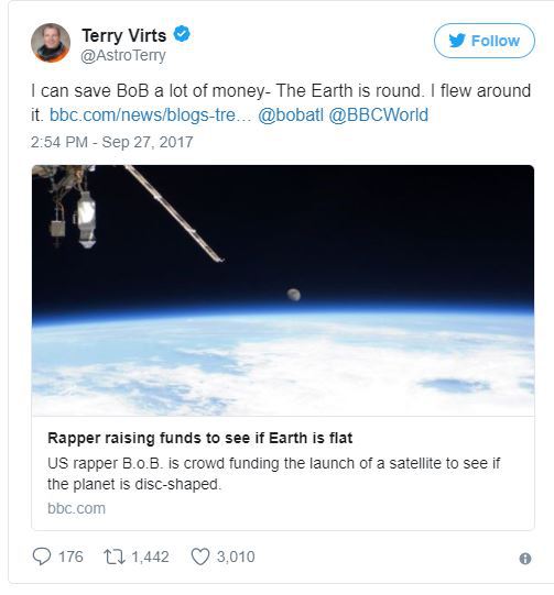 Terry Virts, un alt astronaut NASA, a afirmat: ”Te scutesc de cheltuieli în plus BoB, Pământul este rotund, am zburat în jurul lui”.