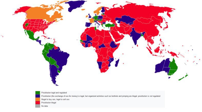 Harta de mai jos prezintă această realitate a lumii. Astfel, cu roşu sunt reprezentate ţările în care prostituţia este ilegală, cu portocaliu sunt colorate ţările în care cel pedepsit este clientul, fiind ilegal să cumperi sex, dar fiind legal să vinzi, verdele reprezintă ţările în care prostituţia este legală şi reglementată, iar movul marchează ţările în care prostituţia este legală, însă activităţile organizate, de tipul bordelurilor, sunt ilegale, iar prostituţia nu este reglementată, relatează Gândul.