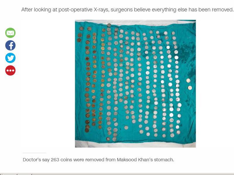 Khan a fost operat în data de 24 noiembrie pentru îndepărtarea obiectelor. Medicii au extras 263 monede şi 100 cuie din stomacul acestuia, în timpul unei operaţii de trei ore.