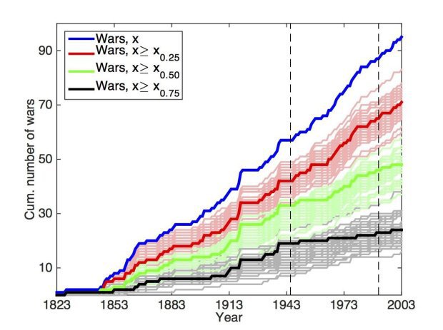Cercetătorul Aaron Claust, din cadrul Universităţii din Colorado, a utilizat analizele statistice pentru a cerceta 95 de războaie din perioada 1823-2003 pentru a observa dacă ne aflăm cu adevărat într-o perioadă unică de pace.