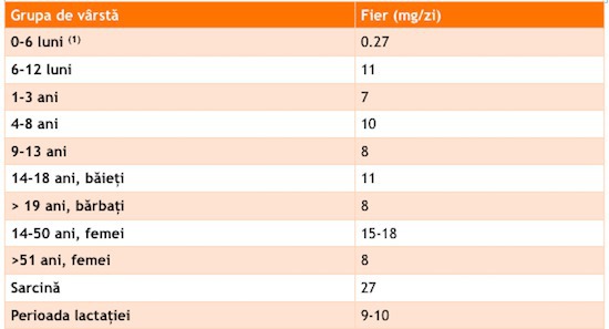 Necesarul de fier pentru diferitele categorii de persoane este prezentat in tabelul de mai jos.