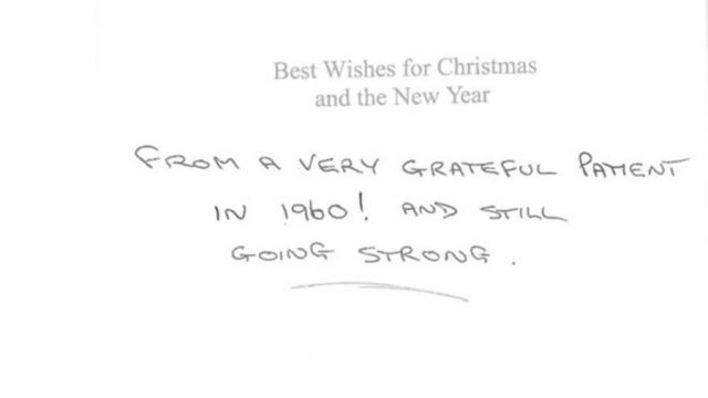 Într-una dintre aceste felicitări scrie: „De la un pacient foarte recunoscător din 1960! Încă sunt sănătos”.