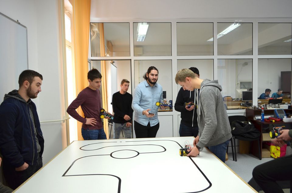 „Am grupat studenţii în şase echipe, am pus materialele la dispoziţie, urmând să construiască o platformă ce trebuia prezentată într-un raport, dar şi într-o competiţie internă în cadrul grupei respectivă care a constat în două probe: urmărirea unei linii tip traseu viteză şi un traseu de obstacole. Obstacolele au constat în intersecţii, un sens giratoriu, întreruperea liniei de deplasare pe o distanţă mare, dar care aveau în dreapta sau în stânga un perete ca robotul să poată urmări, folosind un senzor cu ultrasunete, spre exemplu, un perete acolo unde linia se întrerupe”, a spus profesorul Ioan Doroftei.