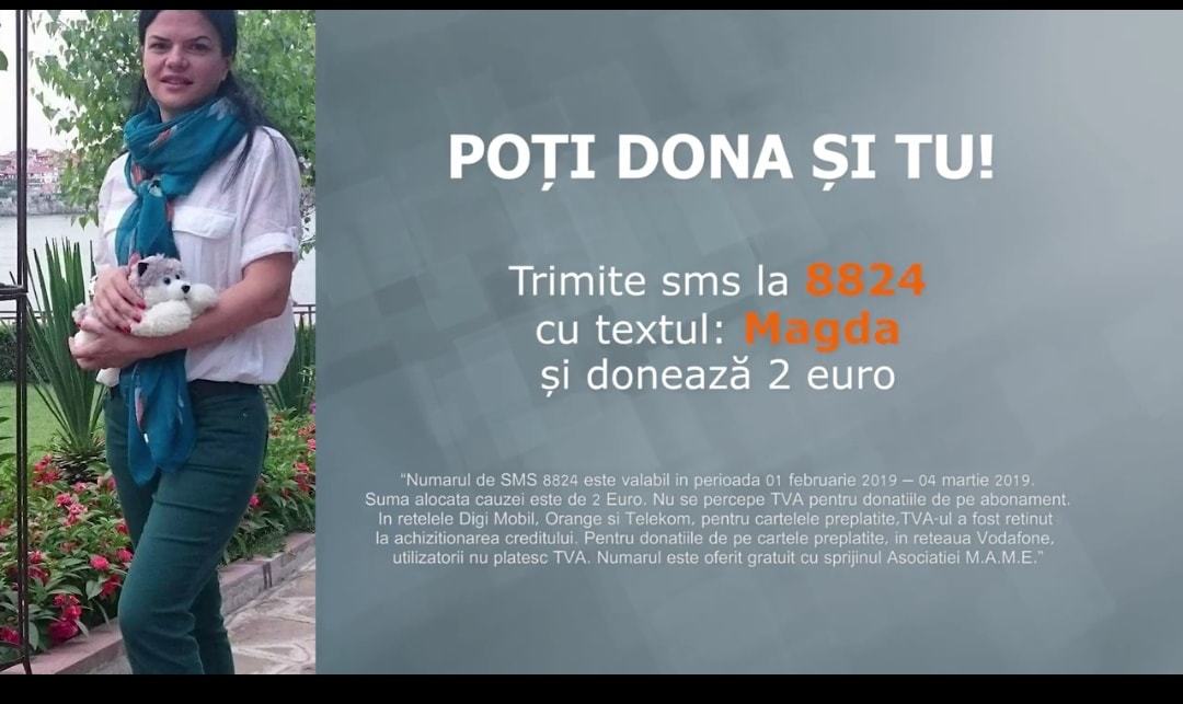 Datorită generozităţii oamenilor, a reuşit deja să strângă 35.000 de dolari. Până la restul sumei e cale lungă, iar Magda, din păcate, nu poate să aştepte. Cu un simplu SMS la 8824, cu textul MAGDA, poţi dona 2 euro şi, astfel, o poţi ajuta să fie mai aproape de şansa unei vieţi mai puţin dureroase. Campania umanitară e deschisă doar pe parcursul lunii februarie. Detalii, în videoul de mai sus.