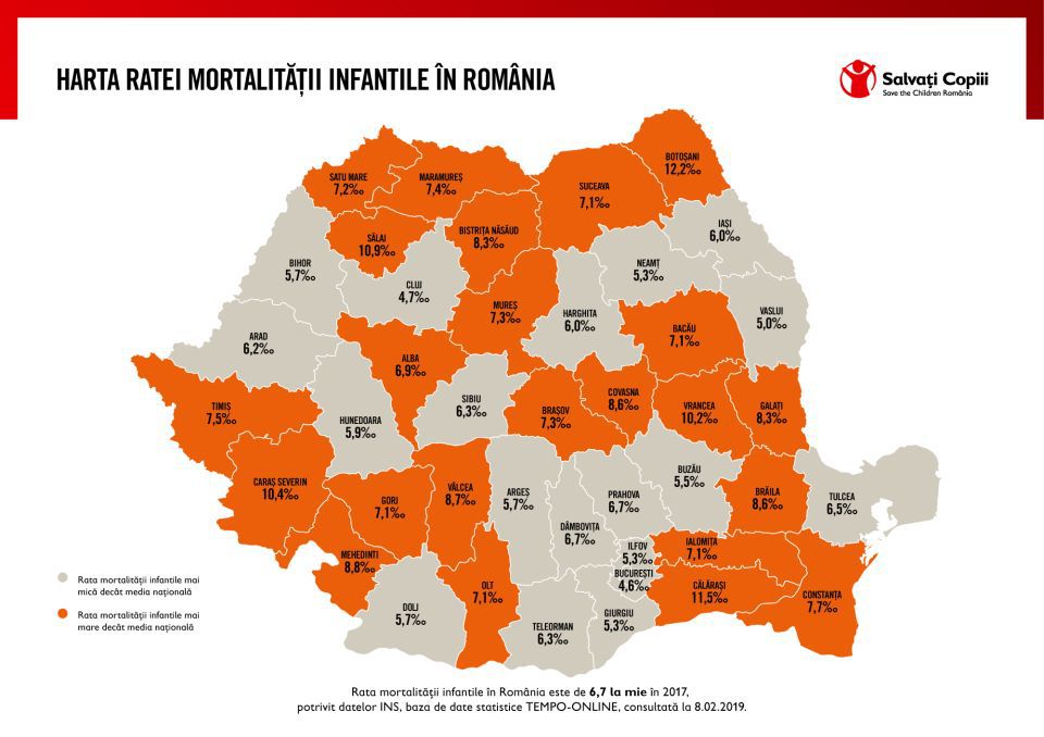 Rata mortalităţii infantile a înregistrat o scădere importantă în România, de la 7,5 în 2015, la 6,7 la mia de copii născuţi vii în 2017, însă rămâne o discrepanţă mare între unele judeţe şi Bucureşti, potrivit ultimelor date ale Institutului Naţional de Statistică, publicate la finalul lunii ianuarie 2019, atrag atenţia reprezentanţii organizaţiei Salvaţi Copiii.
