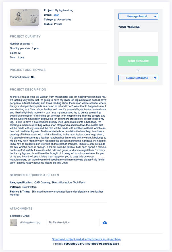 Joan a contactat un site care ajută diverse persoane să găsească servicii unice de care au nevoie. În cazul de faţă, femeia a căutat pe cineva care ar fi putut să-i transforme piciorul amputat într-o „minunată geantă de mână”.