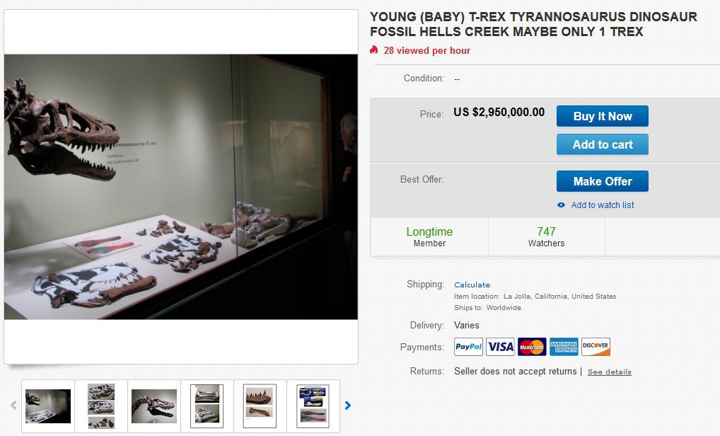 Anunţul a fost puplicat pe platforma online eBay, la preţul de 2,95 de milioane de dolari. Exponatul este descris ca fiind, posibil, singurul exemplar al unui pui din specia Tyrannosaurus Rex şi având o lungime de 4,57 de metri şi un craniu lung de 53,34 de centimetri.