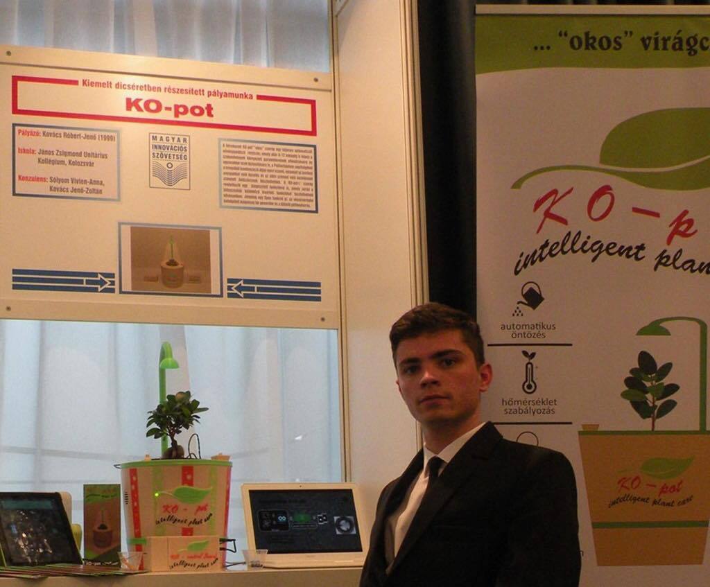 „Invenţia mea constă într-un ghiveci de flori inteligent >, care are o cutie de control ambiental a temperaturii şi iluminatului din casă şi una care face conexiunea la internet prin cablu sau wifi. Utilizatorul are o aplicaţie pe telefonul mobil de unde poate seta parametrii în care să se afla planta respectivă – de temperatură, de umiditate. Sistemul automat îi oferă plantei condiţiile setate de proprietar, iar acesta are acces la o bază de date privind evoluţia plantei de temperatură, umiditate, PH al solului. Ceea ce îl face deosebit pe acest ghiveci inteligent este că atunci când utilizatorul uită să umple rezervorul cu apă sau este plecat de acasă, în concediu, de exemplu, se reumple automat, având un modul de condensare care condensează aerul, iar apa rezultată este tratată cu minerale. Practic, absoarbe umiditatea din aer şi o transformă în apă pentru plante”, a spus Kovacs.