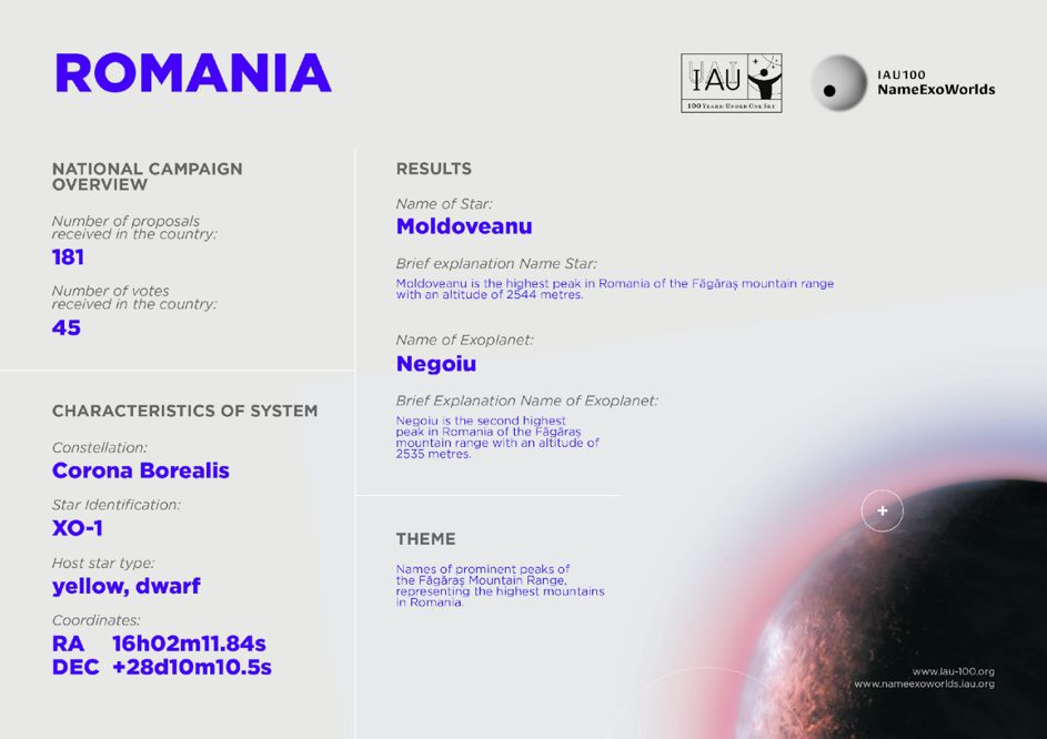 Proiectul „IAU100 NameExoWorlds” a vizat denumirea a peste 110 sisteme de exoplanete şi stele gazdă, fiind a doua oară în istoria UAI când a fost organizată o campanie oficială UAI pentru a da nume stelelor şi exoplanetelor, potrivit Agenţiei Spaţiale Române (ROSA).