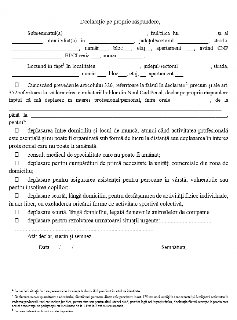 Potrivit acestuia, „liber profesioniştii, PFA prezintă declaraţie pe proprie răspundere. Declaraţiile trebuie să cuprindă, numele, data naşterii, motivul deplasării, data, semnătura”.