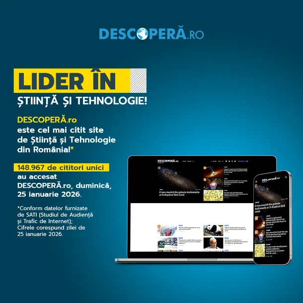 Așadar, conform datelor înregistrate prin SATI (Studiul de Audiență și Trafic de Internet), în ziua de 25 ianuarie 2026, site-ul DESCOPERĂ.ro a fost accesat de 148.967 de cititori unici la nivel global. La nivel național, DESCOPERĂ.ro a continuat să fie lider în categoria Știință și Tehnologie cu 136.892 de cititori unici.