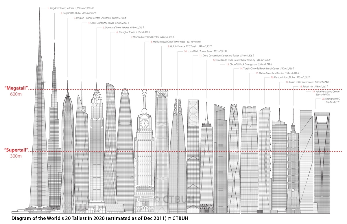 Cele mai înalte 20 de clădiri se vor găsi în 15 oraşe aflate în 7 ţări. China este ţara cu cele mai multe proiecte în acest clasament, 10 din totalul de 20 de clădiri. Aceasta este urmată de Coreea de Sud (3 proiecte), Arabia Saudită (2), Emiratele Arabe Unite (2).