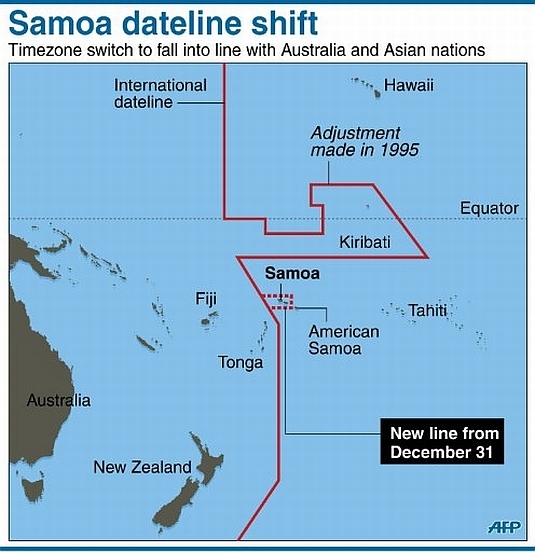 Înainte de schimbare, Samoa se afla cu 21 de ore în urma Australiei de Est şi 23 de ore în urma Noii Zeelande. După schimbare, Samoa este cu o oră în faţa Wellingtonului şi cu 3 ore în faţa australienilor din Sydney.
