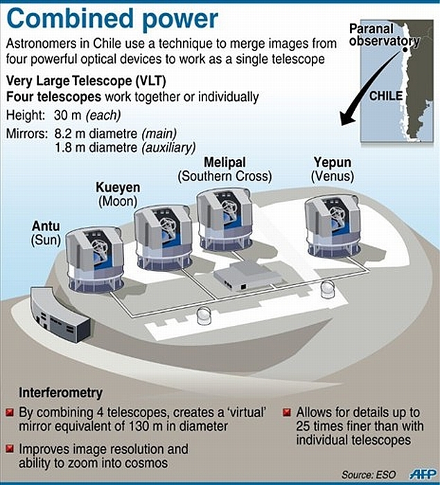 Astronomii au combinat semnalele recepţionate de cele 4 telescoape folosind o tehnică intitulată „interferometrie”, prin care cele patru imagini sunt combinate pentru a obţine o imagine de o rezoluţie mai mare.
