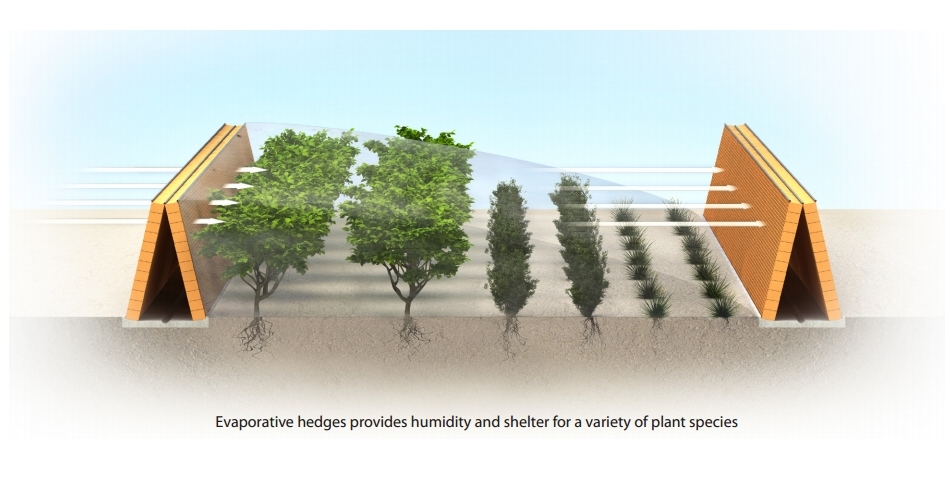 Aerul încins din deşert va evapora umezeala depusă pe seră în timpul nopţii, dar gardurile vii plantate în puncte strategice vor funcţiona ca un aparat de aer condiţionat, păstrând în interiorul serei o temperatură propice creşterii plantelor.