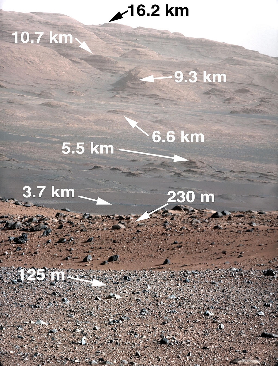Fotografiile arată că muntele Sharp, aflat lângă craterul Gale, unde Curiosity a amartizat pe 6 august, este format din straturi distincte de rocă. Imaginile au fost surprinse cu ocazia celei de-a doua deplasări a roverului pe Marte, călătorie pe care laboratorul spaţial a efectuat-o pentru a studia mai amănunţit stratul de rocă expus de propulsoare în timpul amartizării.