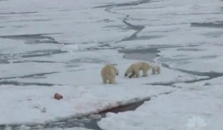 Schimbările produse în Arctic au început să îi uimească şi pe biologi. Luna trecută, o tânără femelă de urs polar, urmată de puiul ei, a încercat să provoace un mascul în speranţa că îi va putea fura hrana acestuia.