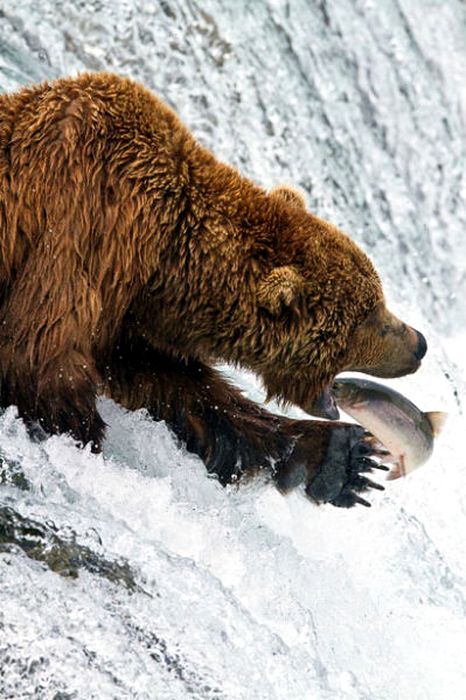 Raul Brook din Parcul National Katmai, Alaska, este unul dintre cele mai populare locuri in care ursii bruni se strang anual pentru a pescui somoni, in timpul uriasei migratii a acestora. Ursii folosesc strategii diferite, de la sariturile in cascade, la scufundari si chiar furtul pestilor de la alti ursi, ceea ce face ca spectacolul sa fie cu atat mai interesant pentru cei care vor sa il urmareasca pe viu. Scenele salbatice sunt atat de spectaculoase incat atrag mii de turisti din toate colturile lumii...