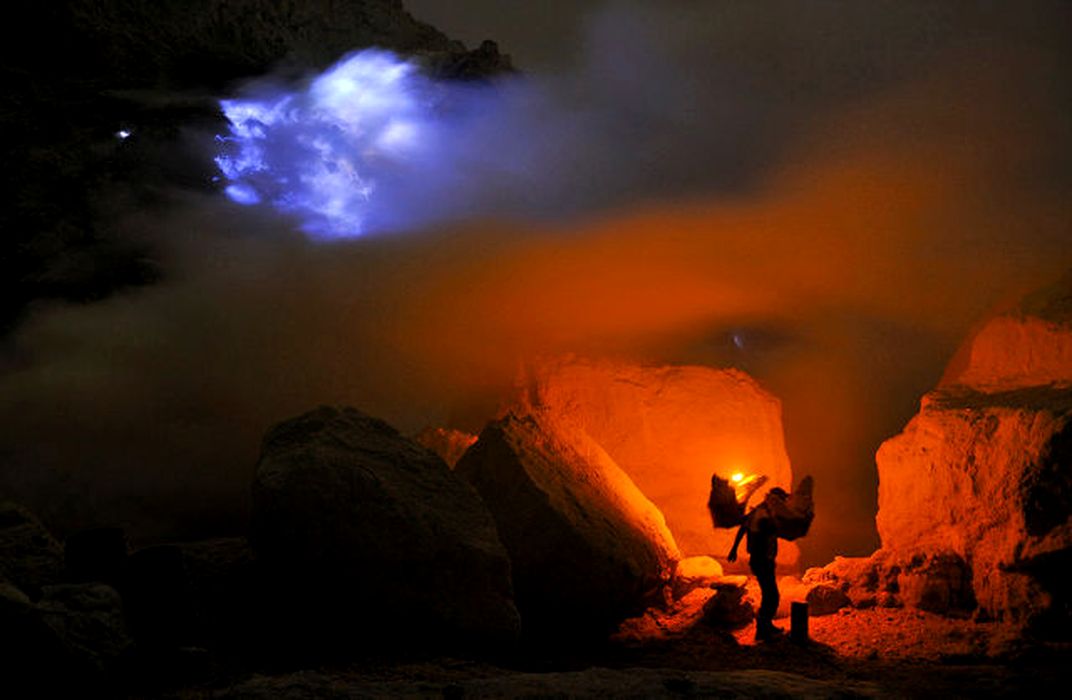 Minele de sulf sapate in craterul vulcanului indonezian Kawah Ijen (2.600 m inaltime), din Java de Est, sunt absolut spectaculoase - o demonstreaza Oliver Grunewald, fotograful care s-a aventurat in craterul adanc de 200 de metri. Gazele emanate de vulcan sunt canalizate printr-o retea de tevi de ceramica, care condenseaza sulful topit. Intre 70 si 100 de kg zilnic extrage un miner de aici, operatiune pentru care este platit cu numai 13 dolari americani pe zi. Kawah Ijen este un stratovulcan: un vulcan compozit - înalt, conic, compus din straturi multiple de lava solidificata, tefra si cenuşa vulcanica.