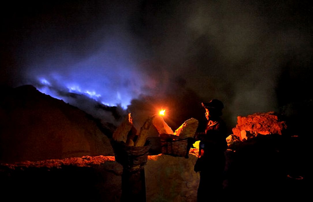 Minele de sulf sapate in craterul vulcanului indonezian Kawah Ijen (2.600 m inaltime), din Java de Est, sunt absolut spectaculoase - o demonstreaza Oliver Grunewald, fotograful care s-a aventurat in craterul adanc de 200 de metri. Gazele emanate de vulcan sunt canalizate printr-o retea de tevi de ceramica, care condenseaza sulful topit. Intre 70 si 100 de kg zilnic extrage un miner de aici, operatiune pentru care este platit cu numai 13 dolari americani pe zi. Kawah Ijen este un stratovulcan: un vulcan compozit - înalt, conic, compus din straturi multiple de lava solidificata, tefra si cenuşa vulcanica.