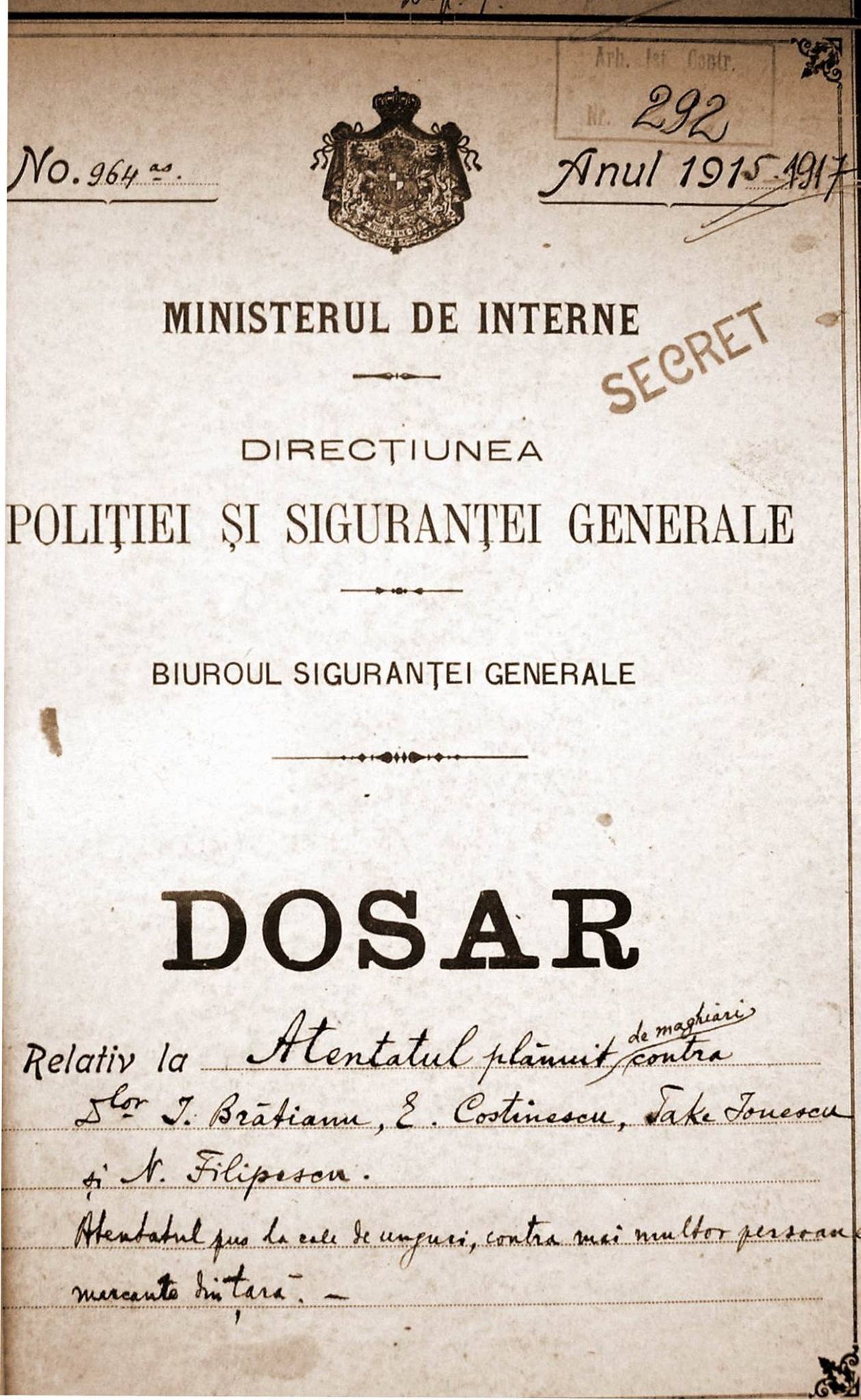 În timpul neutralităţii României (1914-1916), la 1 decembrie 1915, poliţiştii români au cercetat un atentat în urma căruia urmau să fie asasinaţi premierul Ion I.C. Brătianu, Take Ionescu şi Nicolae Filipescu.Asasinatul a fost comandat de Puterile Centrale, cu scopul de a elimina adversarii intrării României în război, de partea Antantei.