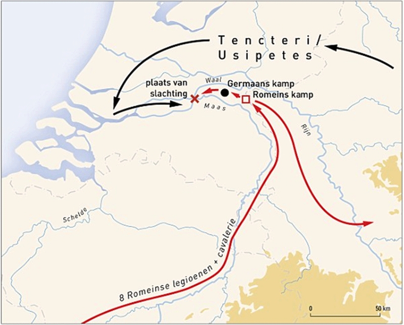 Cele două triburi germanice implicate în bătălie erau cunoscute în acea perioadă sub denumirea de tencteri şi usipeti. Aceste populaţii proveneau dintr-o zonă de la est de râul Rin şi încercau să-l convingă pe Caesar că vor să se stabilească pe teritoriul Republicii. Triumvirul a respins în mod constant intenţiile populaţiilor germanice, iar în anul 55 î.Hr. a ordonat celor opt legiuni ale sale să distrugă triburile tencterilor şi ale usipetilor.