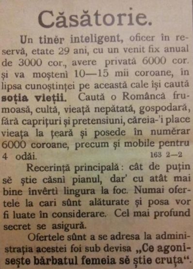 În anul 1909, un tânăr ofiţer al Armatei Române publica într-un ziar un anunţ prin care încerca să-şi găsească sufletul pereche. Încă din titlu ne putem da seama de intenţiile soldatului: „Căsătorie”, în timp ce textul are scopul de a prezenta în detaliu toate cerinţele pe care le avea cel aflat în căutarea marii iubiri.