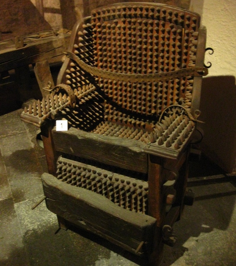 Acest tip de tortură era folosit, în mare parte, pentru a obţine mărturii sau pentru a impune omului să recunoască comiterea crimei. Acest scaun de metal este acoperit cu circa 1500 de ace şi dotat cu curele care fixau victima de scaunul ce treptat era încălzit, provocând arsuri şi dureri îngrozitoare.