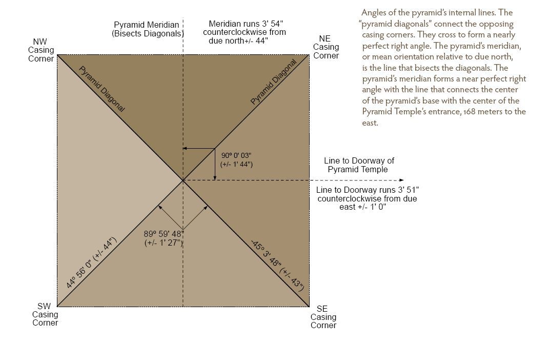 Primul lucru pe care cercetătorii trebuiau să îl afle era să identifice poziţia blourilor de calcar, căutând urme ale prezenţei acestora şi examinând zonele de la baza piramidei. Specialiştii au aflat astfel că, iniţial, construcţia avea la bază între 230,295 şi 230, 373 lungime, însă acum partea estică are între 230,378 şi 230,436 metri lungime, ceea ce înseamnă că cea din urmă este mai lungă decât latura estică cu aproximativ 14,1 centimetri.