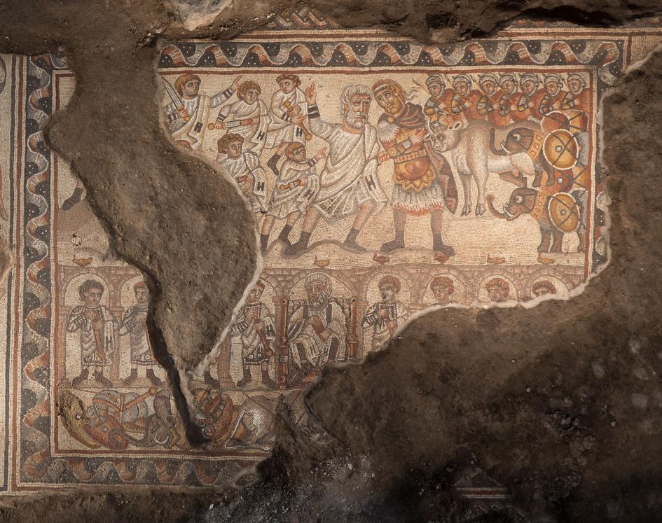 Scenele redate în mozaic includ şi elefanţi echipaţi pentru luptă, ceea ce i-a determinat pe specialişti să creadă că este vorba de povestea macabeilor, liderii iudei care, la jumătatea secolului IV î.Hr., au iscat o revoltă împotriva Imperiului Seleucid condus de urmaşii generalilor lui Alexandru cel Mare.