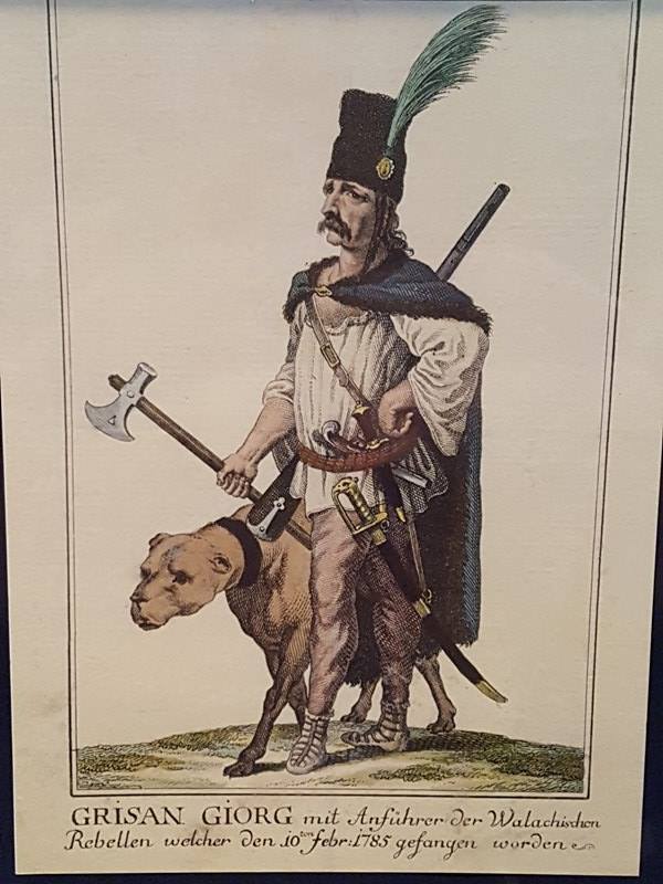 Sub imagine scrie, în limba germană, „Crişan Gheorghe, conducător al rebelilor valahi, care în 10 februarie 1785 a fost capturat”.