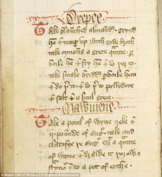 În anul 1300, Guillaume Taillevent, bucătar la curtea lui Charles al-V-lea al Franţei, şi-a notat tehnicile de gătit într-o carte în care erau incluse şi reţete pentru aristocraţi, precum supa de pui. În jurul anului 1390, bucătarul personal al regelui Richard al-II-lea a scris o carte de bucate ce includea 196 de reţete create atât pentru servitori, cât şi pentru familia regală. În acea perioadă, printre delicatesele consumate se număra lebăda, păunul şi ,,blanc mang”(budincă din lapte), însă precum în cărţile anterioare erau precizate doar ingredientele, nu şi modul de preparare. Prima carte de bucate tipărită a fost publicată în Veneţia de către Laurentius de Aquila şi Sibylinus Umber, în 1475.