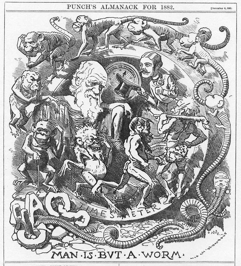 Chiar şi aşa, efectele au fost resimţite. O dovadă concludentă o reprezintă imaginea de mai jos unde se ilustrează evoluţia omului (lui Darwin) dintr-un vierme, cu titlul ”Man is but a Worm” (omul nu este decât un vierme).