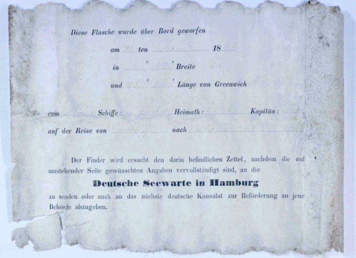 Pe cealaltă parte a hârtiei era un chestionar, unde oricine care găsea sticla trebuia să scrie când şi unde a găsit-o, iar apoi să trimită documentul la Observatorul Naval German din Hamburg sau la cel mai apropiat consulat german.