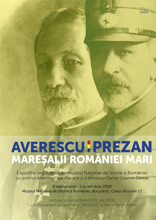 Muzeul Naţional de Istorie a României (MNIR) organizează joi, 6 septembrie 2018, începând cu ora 16:00, deschiderea expoziţiei „Averescu şi Prezan. Mareşalii României Mari”.