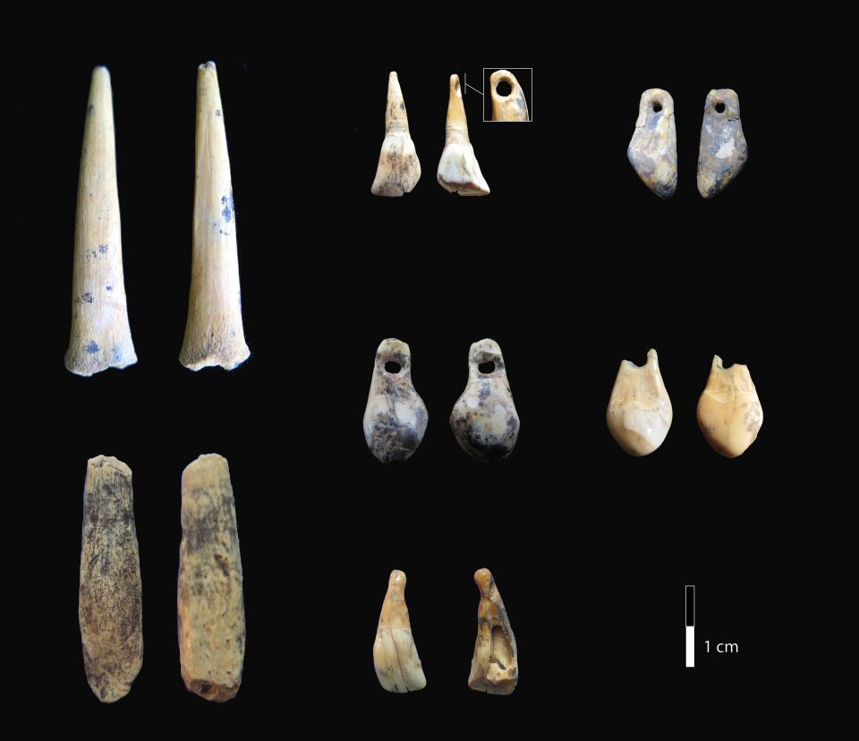 Vârfuri de săgeată din os şi dinţi perforaţi din prima perioadă a Epocii de Piatră tărzii descoperiţi în peşetera Denisova. Credit foto-Katerina Douka