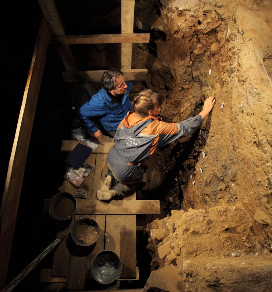 Natalia Belousova (Academia de Ştiinţă din Rusia) şi Tom Higham (Universitatea Oxford) în timp ce extrag probe din principala încăpere a peşterii Denisova. Credit foto-Sergey Zelinski, Academia de Ştiinţă din Rusia